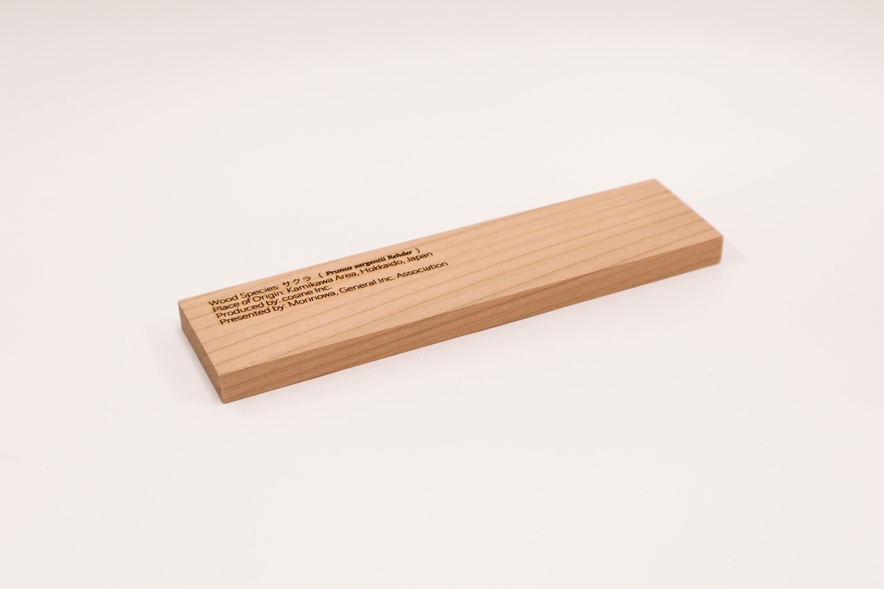 【サクラ(エゾヤマザクラ)】落葉広葉樹。高さ20m。北海道のお花見といえばこの樹種。5月に開花します。明るい環境を好み、林内で周囲の木が覆いかぶさってくると負けてしまいます。7月に熟れるさくらんぼ(果実)、苦みがあってヒトにはおすすめしませんが、野生動物にとっては大事な食料です。緻密で粘りがあり細かい加工に向いているので、版木や和菓子の型に使われていました。水にも強く食器やカトラリーにもむいています。経年変化が楽しめる木で、ピンク色が段々と飴色に変わり、耐摩耗性が高いため使い込むほどにツヤも増してきます。サクラの木は香りも良く、加工していると花のような甘酸っぱい香りがするのはバラ科だからでしょうか。削り屑はスモークチップになり、チキンとの相性が抜群です。