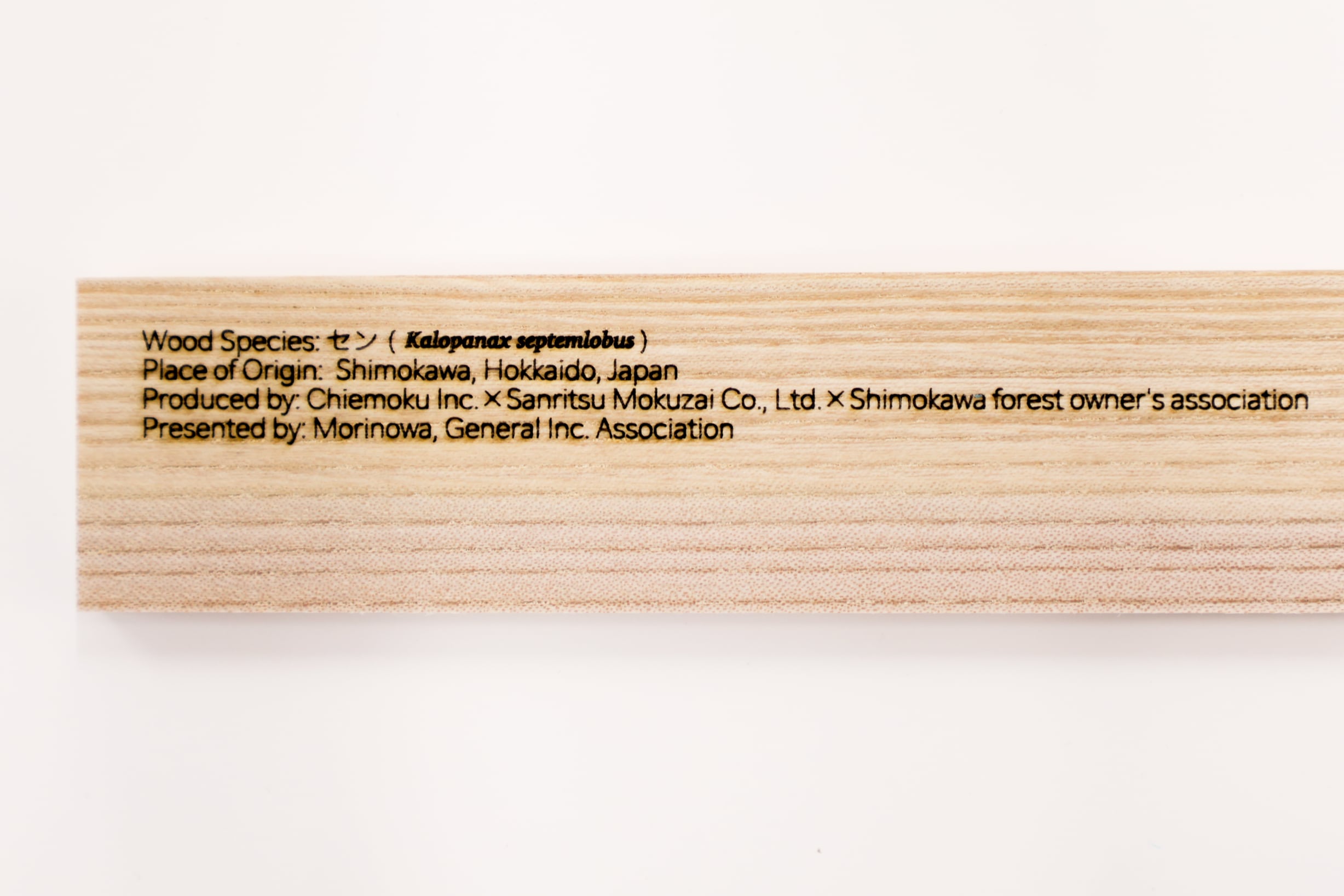 【セン】落葉広葉樹。高さ20m。手のひら状で、大人の顔くらいの大きさの葉っぱが特徴的です。秋には黄色く色づきます。若 木や枝にはトゲがあります。春、若い芽はおいしく食べられます。同じ樹種であれば材質も同じ?成育した環境や遺伝子の違い によって、広葉樹は成長が早い(年輪幅が広い)ほうが比重が高く、成長が遅い(年輪幅が狭い)ほうが比重が軽くなります。 年輪幅が極端に狭いものを糠目( ぬかめ) といい、真っ直ぐな木目が美しい反面、材がもろいので適材適所で使います。センは この差が顕著で「ヌカセン」「オニセン」と、区別して呼ばれます。